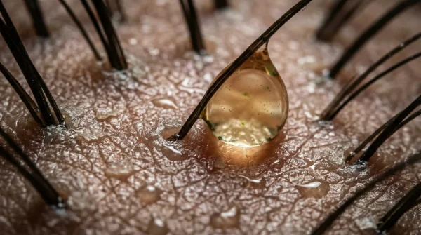 Dry hair is porous and scatters light, making it look pale. Oil fills those microscopic gaps, preventing light from scattering and making the hair appear deep brown or black.
